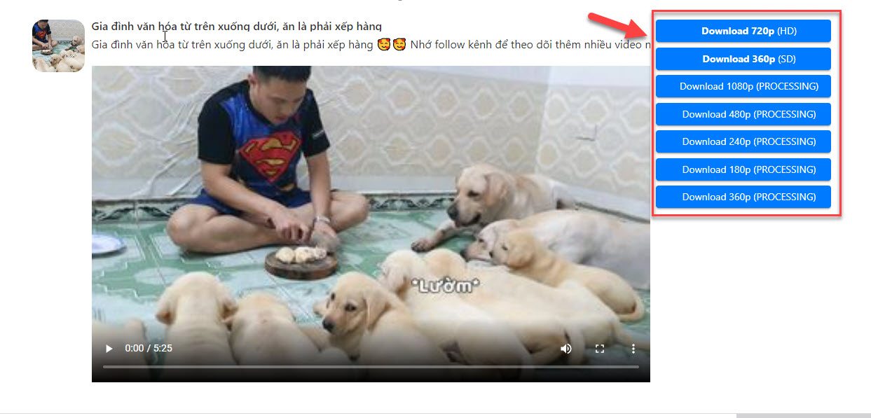 Step 3: The user chooses the quality of the video he wants to download including: 270P, 360P, 480P, 720P or 1080P. Now we wait a few seconds for the tool to process the request. When successful, it will say "Your video has been successfully displayed".